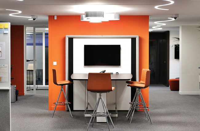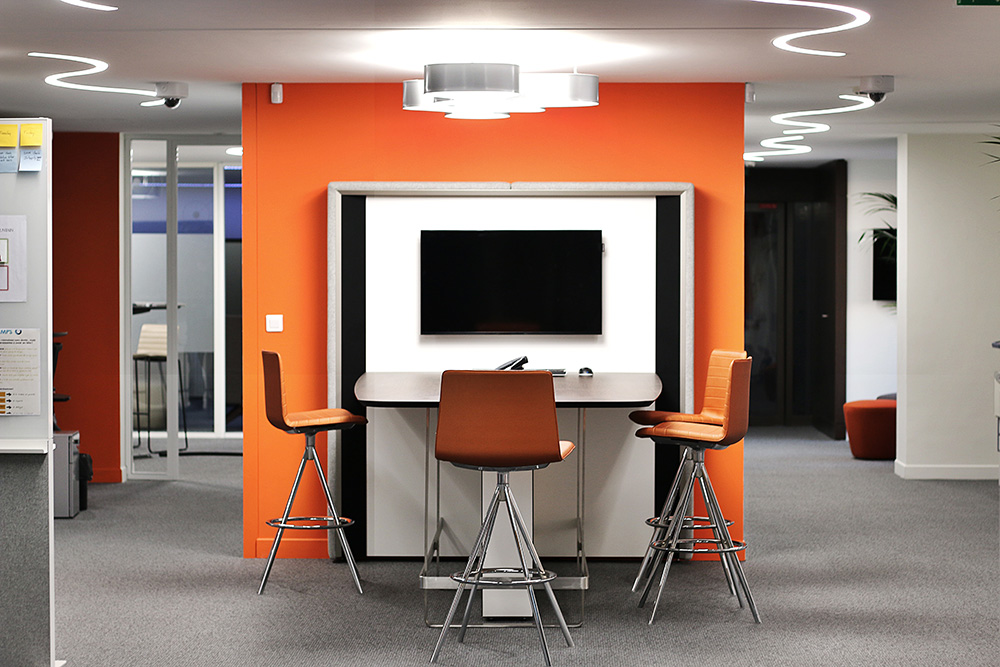 Descriptif : Aménagement de 1000 postes de travail assis-debout, salles de réunion, tables hautes, rangements et espaces divers.