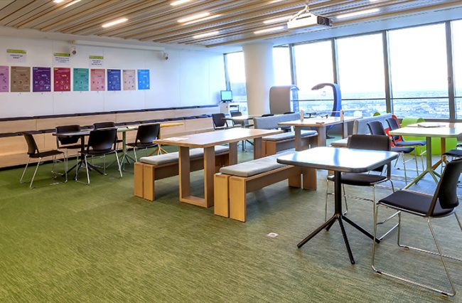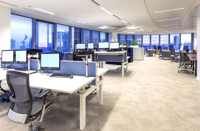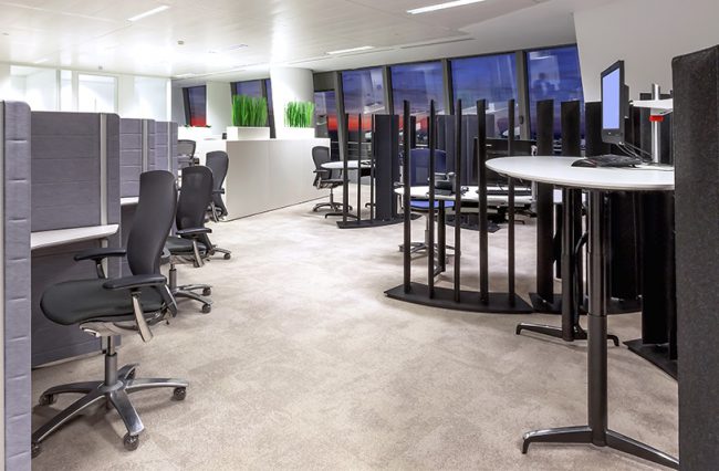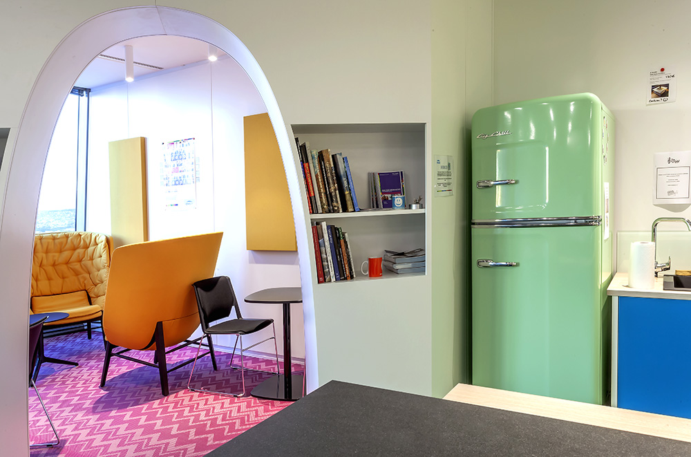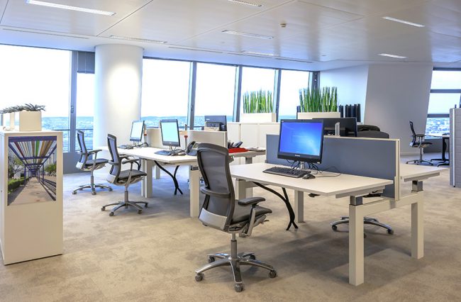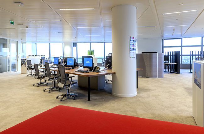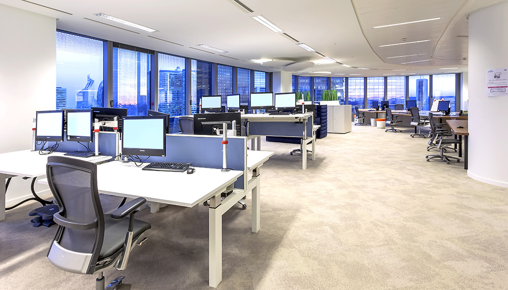 Descriptif : 188 postes de travail réglables en hauteur par vérin pneumatique et postes de concentration réglables en hauteur électriquement avec paravents acoustiques à opacité variable, tables, bancs et fauteuils pour l’espace « Places du Village », rangements avec bacs et plantes décoratives et privatives.