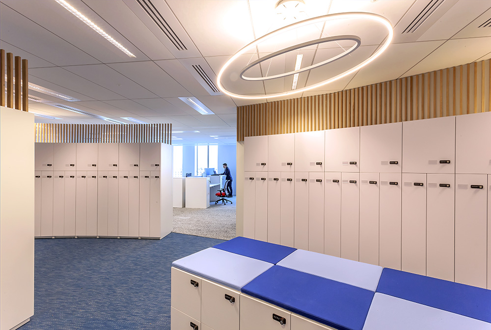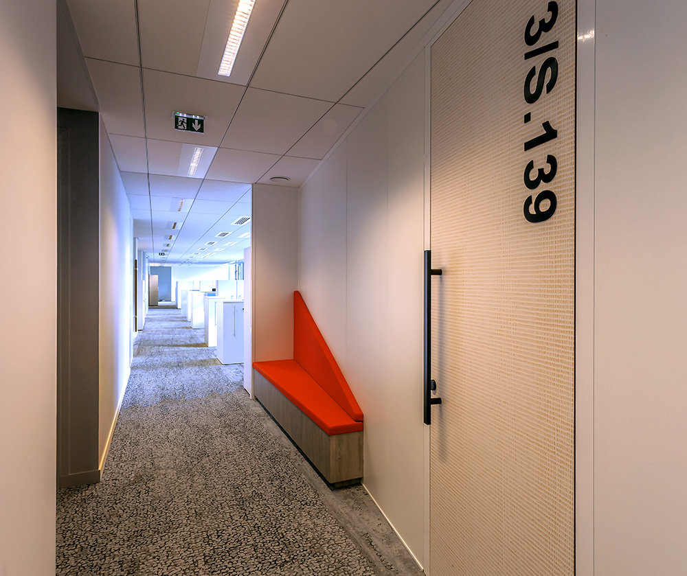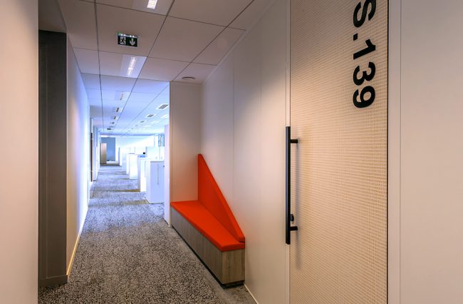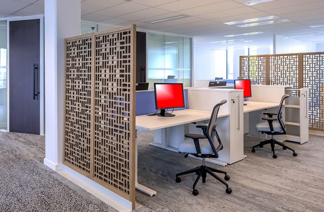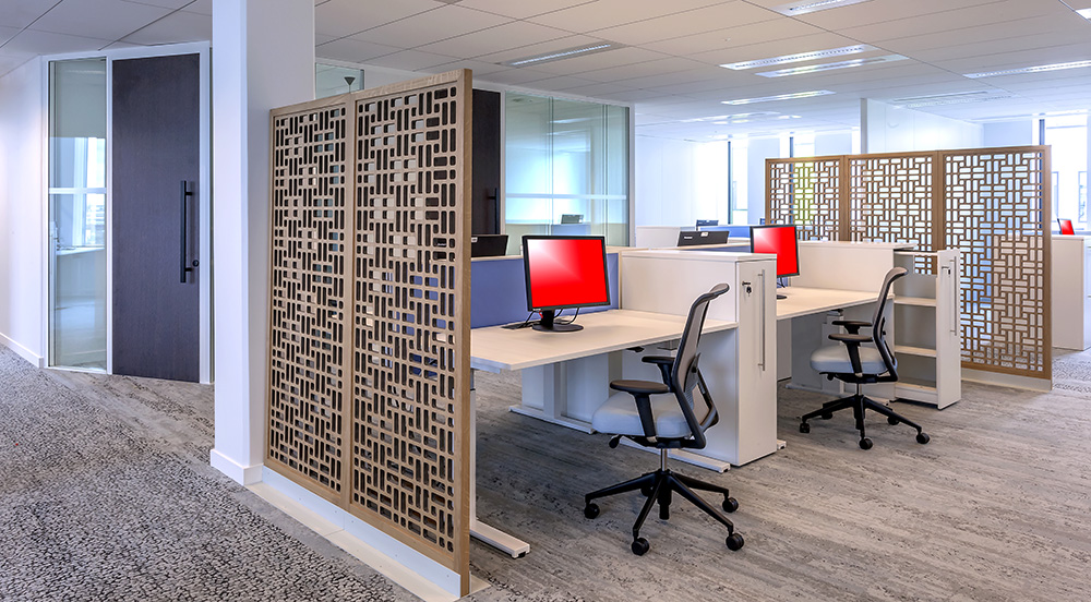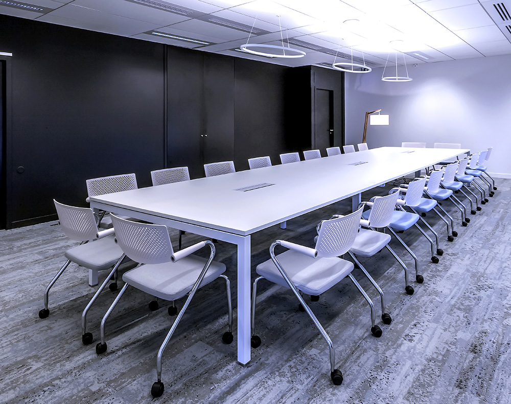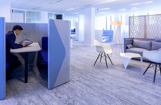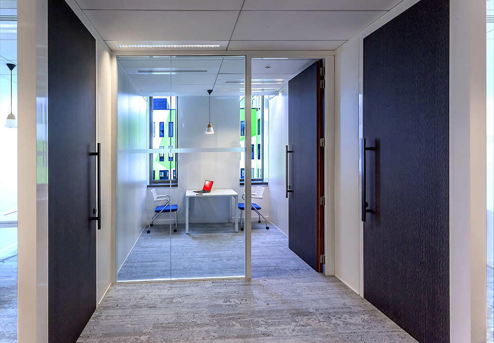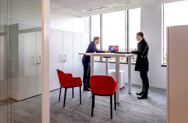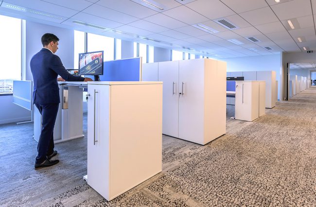 Descriptif : Installation de plus de 1000 postes de travail réglables en hauteur, caissons, armoires, nombreuses salles de réunion et bulles de confidentialité.