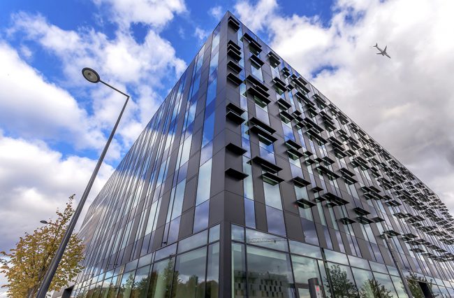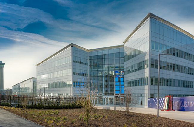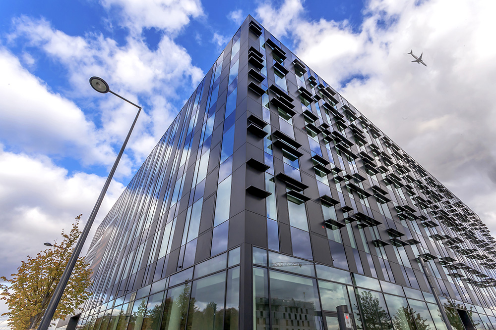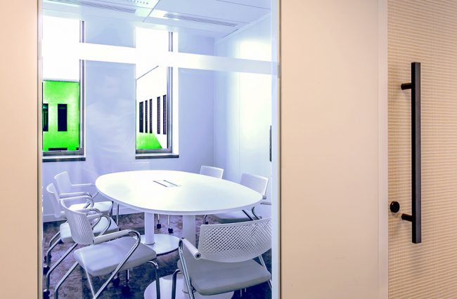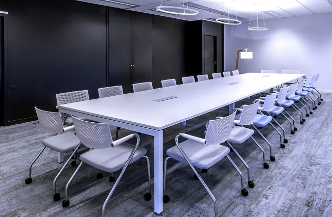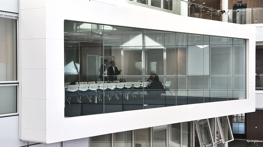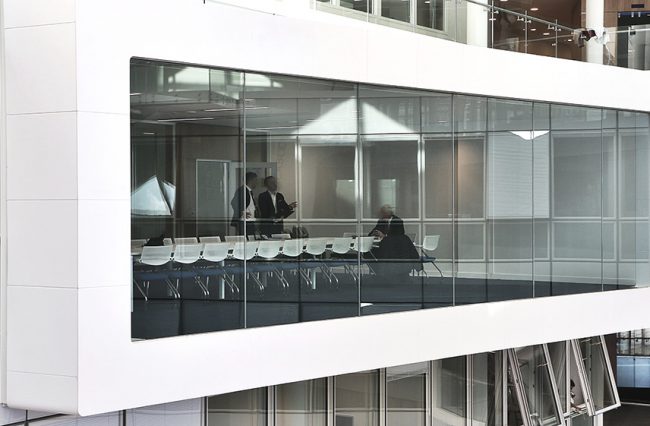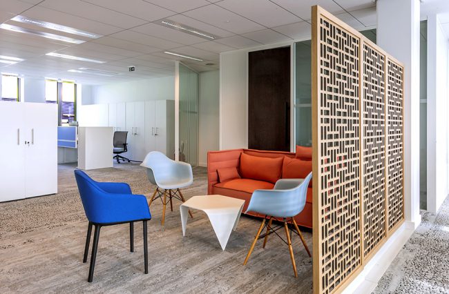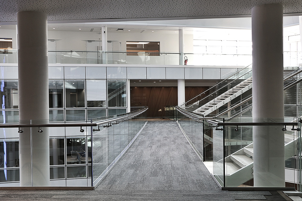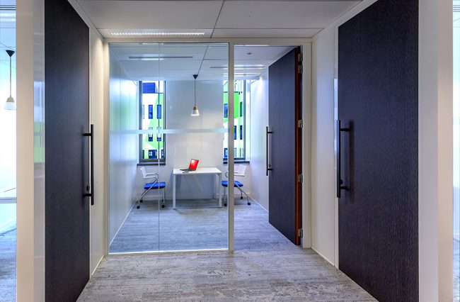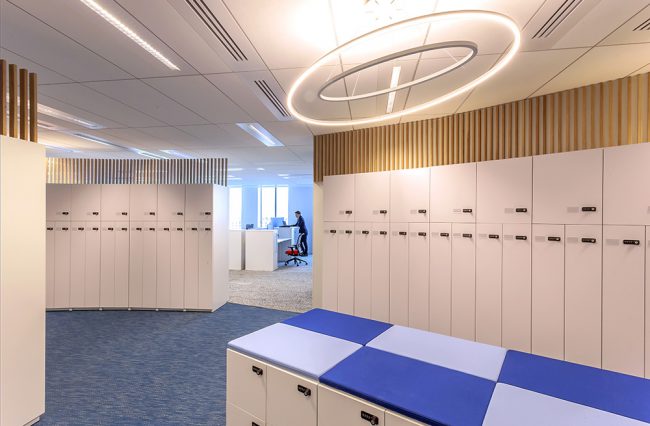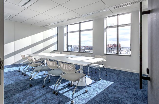 Descriptif : Installation de plus de 1000 postes de travail réglables en hauteur, caissons, armoires, nombreuses salles de réunion et bulles de confidentialité.