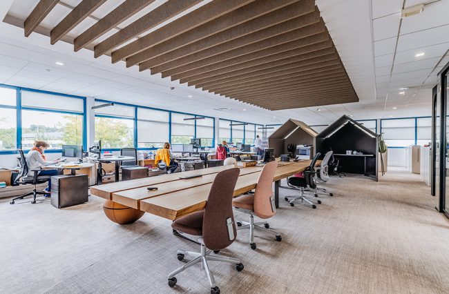 Points d’Intérêts : A l’étage, une table en chêne massif de 6 mètres de long est la pièce maîtresse de cet espace de coworking.